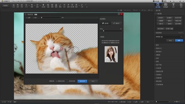 第三步:比如我们这里点击选择“自动抠图”后,在右侧点击“选中笔”按钮,在中需要保留的部分划线,然后点击切换到“删除笔”,在不需要的部分划线,点击“替换背景”就可以了;