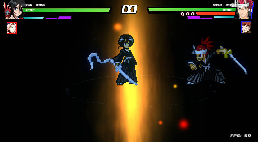 6、死神角色和剑心专属技能。在受击时释放辅助键(P1为O,P2为6)可触发,角色将进入短暂无敌状态,反弹敌人攻击并立即恢复站立姿态。