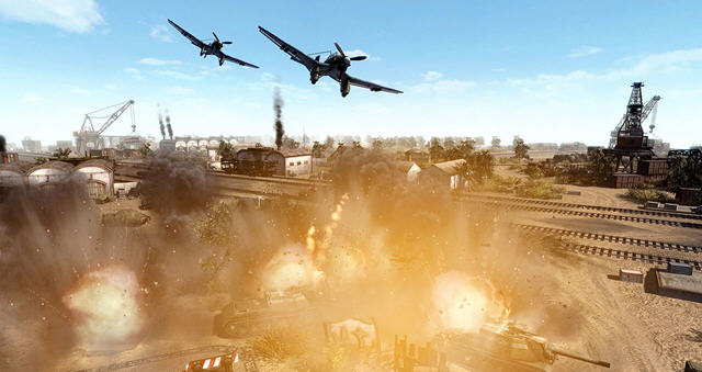 载具上依然以坦克和飞机为主,被飞机轰炸后的城镇会留下各种弹痕,另外还有各种不同的任务来挑战玩家在不同地理环境中的策略运用。
