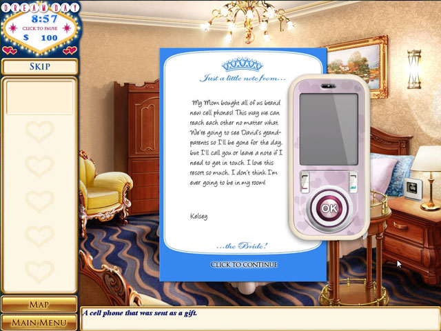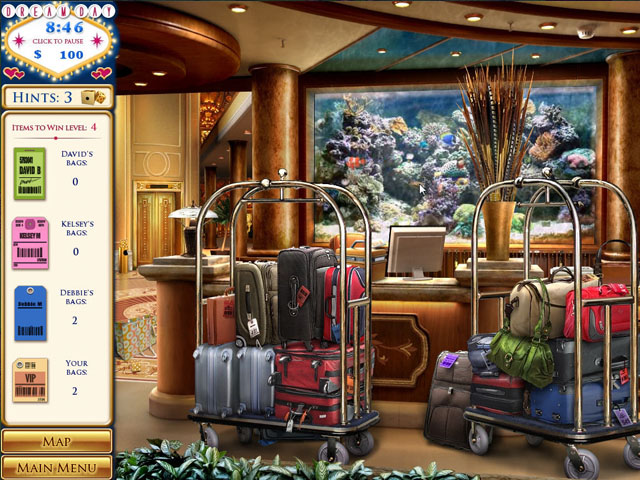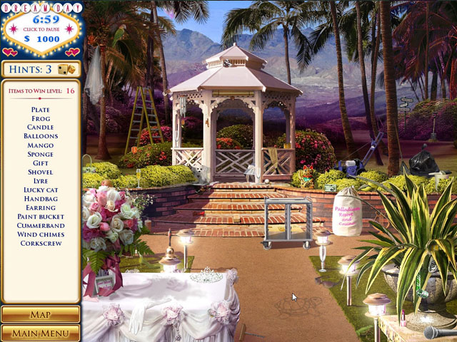 梦幻婚礼系列找物游戏这次来到了世界赌城‘拉斯维加斯’,在这次的游戏中,玩法有了些许变动,每一个找物或者解谜小游戏成为独立的个体,在寻找的同时也别忘了收集现金,之后可以购买婚礼所需要的物品,还有黄色的小筛子,那是提示的道具。