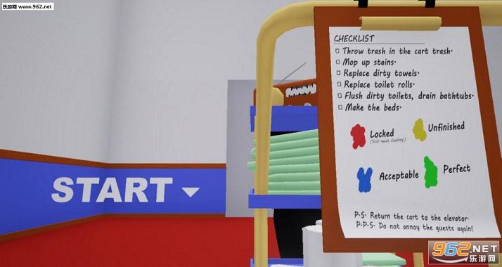 该作品根据虚幻引擎打造,而且玩法非常的奇葩,你不能把它当做是一个简单而且正常的清扫游戏,你会在你的清洁工作上遇到各种各样的困难,例如上锁的房间,充满垃圾的地板,各种污渍的厕所,加上脾气反常的客人,简直就是一场虐心的体验。