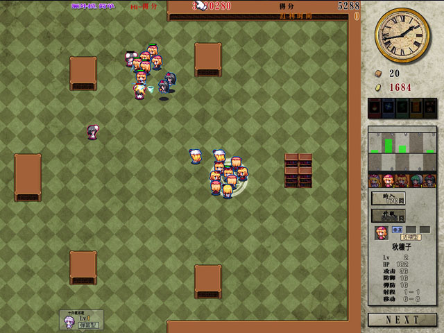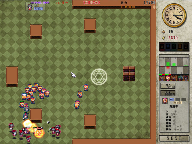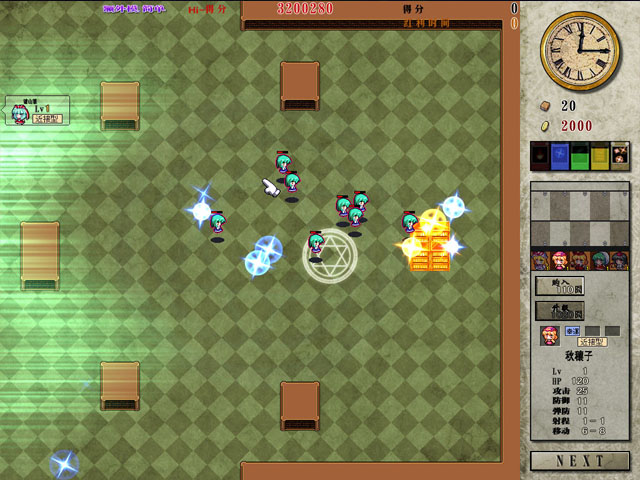 本作其实就是一款塔防游戏,但是造出来的不是防御塔而是东方中的人物,进入时挑选5种人物进入,守卫图书馆,获得金钱之后不断升级,购买新的士兵来加入防御队伍。还有5种魔法可以使用,不过有次数限制,所以谨慎使用。