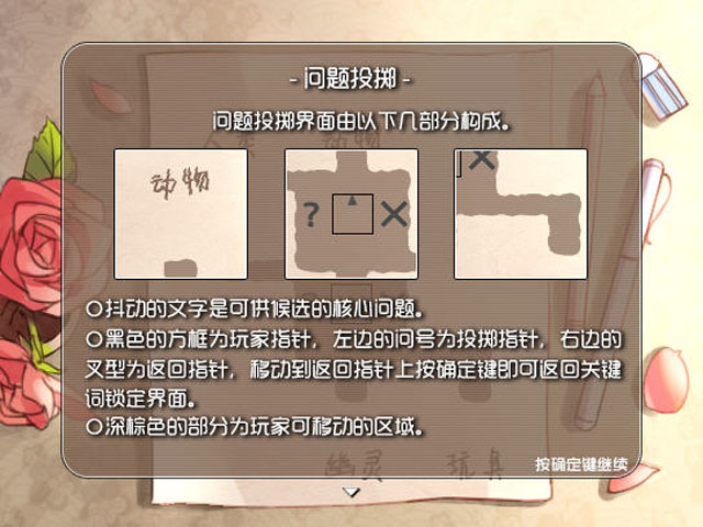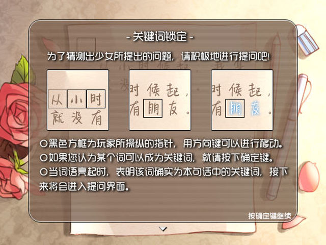 游戏的进行方式比较新颖,让玩家自己来对女孩进行提问,一步一步了解事件的真相,这是一个温馨而又感人的小故事,适合慢慢的欣赏。