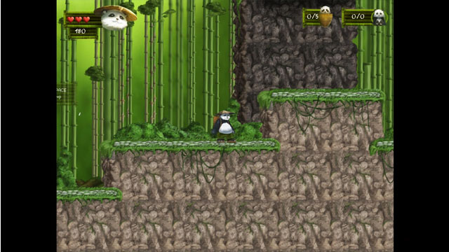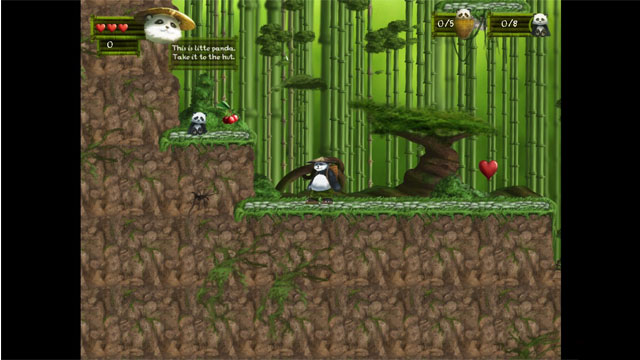游戏比较简单,玩家将扮演一只会功夫的熊猫,在竹林中跨过陷阱,击倒敌人,不过要注意血量只能对敌人起作用,如果掉入陷阱就直接挂掉了。