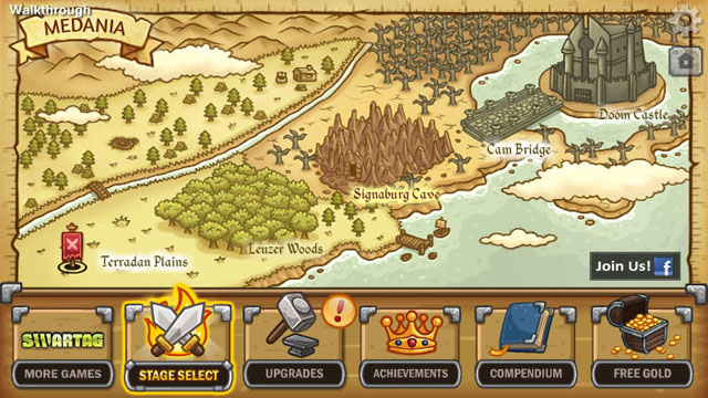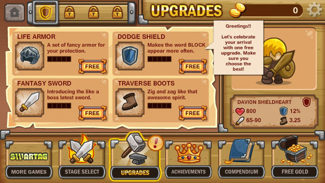 游戏的内容十分丰富,从刚开始什么都没穿的小骑士到一步步迈向‘黄金甲’全靠玩家的能力了。每一个关卡都有3个不同的难度,而且每个难度的战斗条件也不相同,有些是在规定时间内杀敌,有些是1滴血无伤杀敌等等,从而获得不同的成就,注意获得新成就时可以领取相应数量的金币哦。