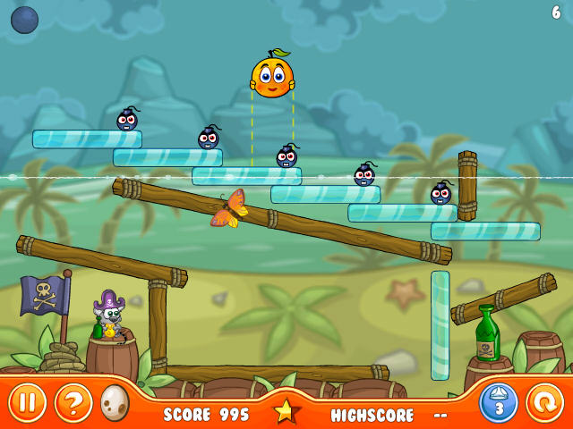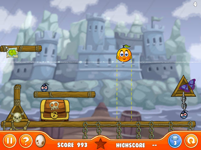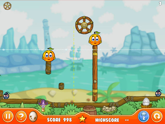 保护橙子算是比较难的物理游戏了,运用的道具很多,很多也是通过间接接触的方式来完成,提示也比较少,不过有3次的PASS机会就是使用右下角头盔的标志,总的难说有些难度,需要好好的动动脑经才能完成。