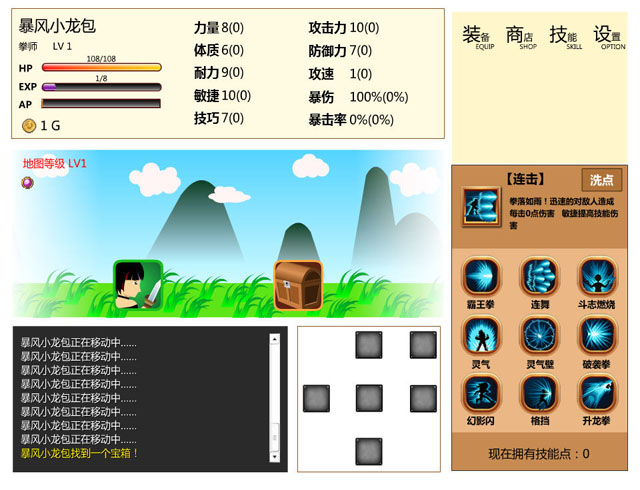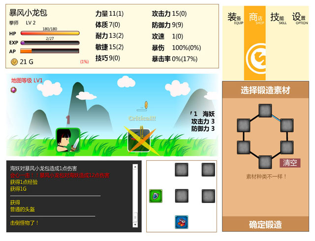 《无尽冒险之旅》是一款玩家自制的放置类游戏,玩家在初次进入游戏时从5个职业中选择自己喜欢的,再输入名字就可以开始游戏了,基本上只用换换装备加下技能点,如果装备多了可以看一下商店,锻造一下装备即可,战斗和移动都是全自动的。