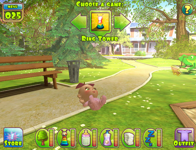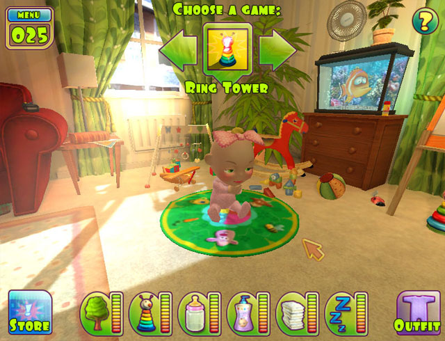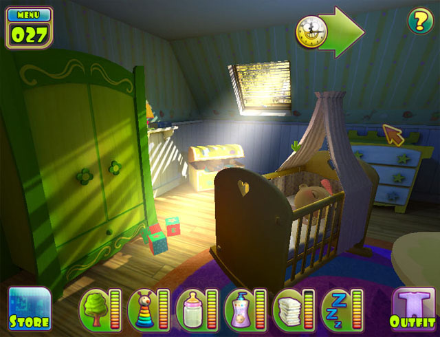 游戏采用3D的画面,宝宝的动作,神情都显得尤为可爱,照顾小宝宝的同时还可以通过一些小游戏来赚取金钱,点击左下方store按键可以进入商城来购买更多的道具,而正下方每个图标边上的柱条分别代表体力、饥饿、游戏、睡眠等的程度,如果格子减少的太多的话,说明需要进行这项活动了。