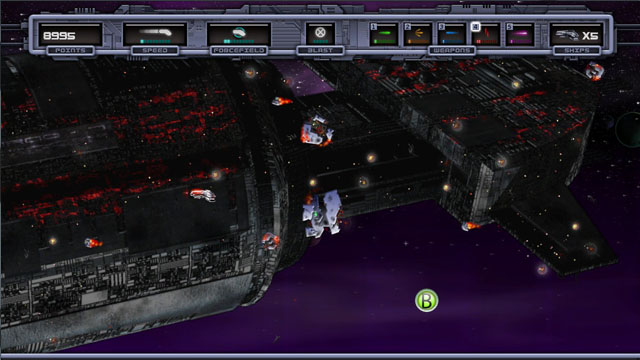 对于飞行游戏而言,最重要的还是躲避各种迎面而且的子弹以及障碍物,在本作中敌人去来自四面八方,不过玩家也有多种攻击形态来迎战他们,绿色的是正前方直线子弹,黄色的是前方散弹,蓝色的是尾部直线子弹,红色的是上下方子弹,紫色的是前方近距离子弹。