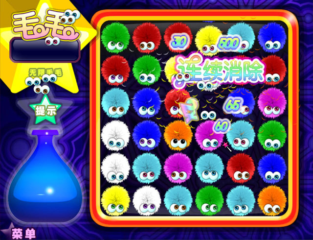 拖动毛毛球使三个以上的连在一起,可以直线连,也可以直角连,但不能斜线连。随着关卡的增加,还会出现大毛毛,以及被锁住的毛毛以增加难度;同时消除五个以上的毛毛球可以得到超级毛毛,消除它可以炸掉周围的其他毛毛。