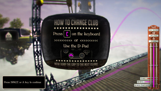本作是一款很特别的高尔夫游戏,我们比赛的地点是悬浮在空中,并且还游戏如电扇等外力因素。另外还有很多摄像头和机械鸟帮助你,还有如镜头回放等的特色功能。