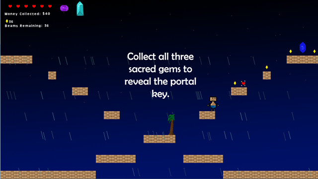 宝石收集者是一款动作冒险类的游戏,进入游戏时有三颗爱心和一定的子弹,收集到三个大的宝石之后就会刷出钥匙,捡到钥匙之后就可过关。在主菜单按2可以切换资料片地图。游戏操作方式也比较简单,攻击水瓶还会掉落爱心,有些长距离的坑需要通过shift加速后才能跳过。控制角色,用子弹消灭敌人并收集更多的宝石来过关吧。
