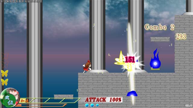 可操纵角色:灵梦,魔理沙,EX。 系统是经典的横向卷轴动作。除了普通攻击之外还有超必杀,固有技,支援技等多样的攻击方式。当然,角色的能力也有从RPG中借鉴来的成长系统进行调整。丰富的要素再加上流畅的操作感,令人胃口大开。 不过比起C82的幻想乡之谜,可玩性要稍微低一些。