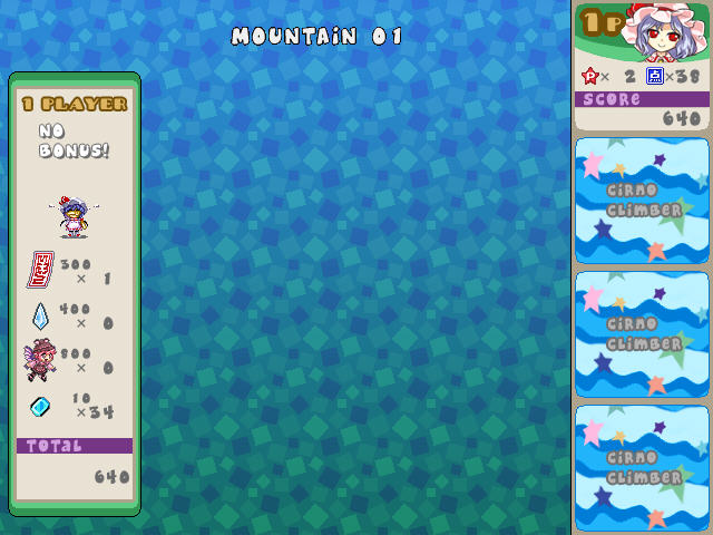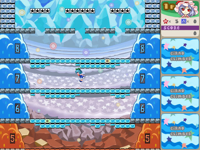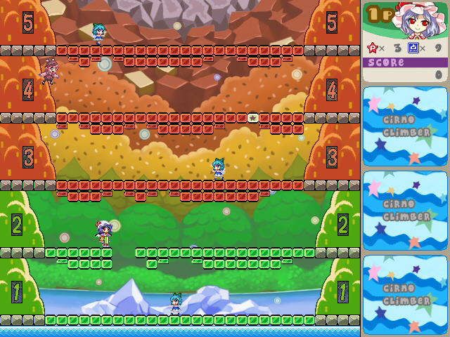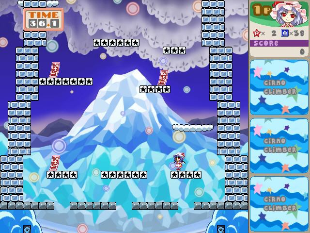 一款东方题材的复刻任天堂上的ICE CLIMBER这款游戏,由於重现了游戏的要素,你的动作简直是无法想像的笨拙,而且还有一堆敌人干扰你,还原度很高,总之就是爬到最上面。