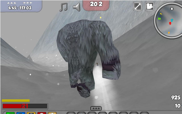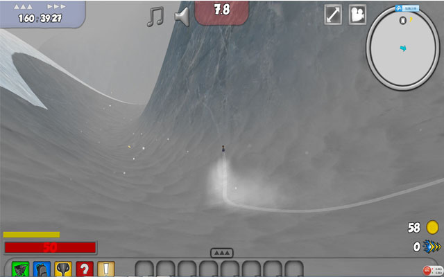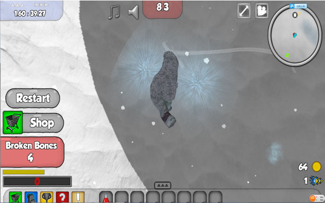 游戏中玩家从高山上往下速降,在速降的时候吃金币、躲避障碍,还会随机刷新拦路的大雪怪,一不小心栽跟头、或者被大雪怪捶到扁,那只能大喊一声OMG!然后一路滚啊滚摔个稀巴烂。