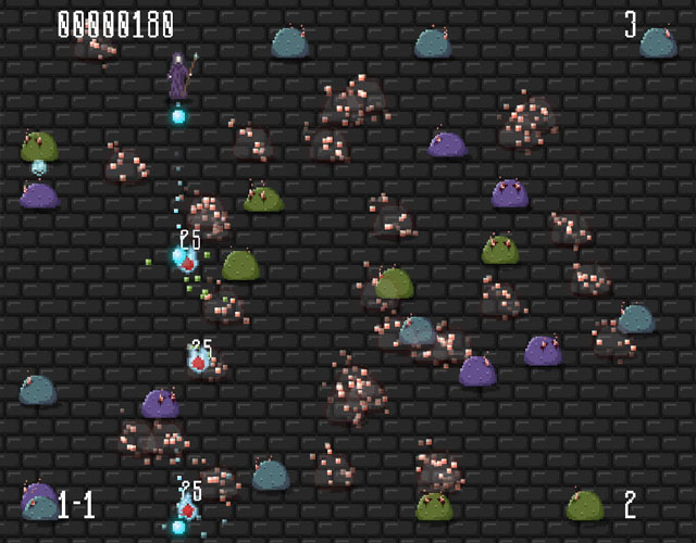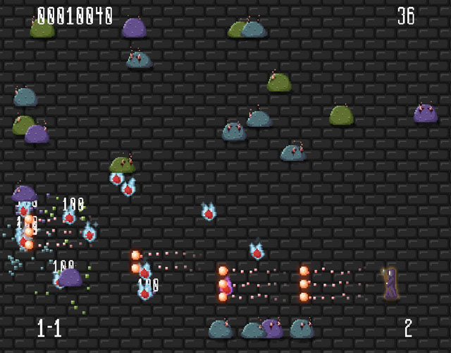 游戏的玩法很简单,就是躲开并杀掉怪物,收集他们留下的物品然后继续杀戮,游戏没有镜头玩家只要技术够好就可以无尽杀戮。
