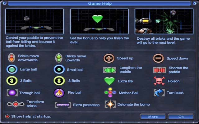 毁坏所有砖块, 保留更多的弹球继续比赛,并获取降落的奖金项目。游戏开始时难度足够容易, 但迅速的转变将使你面对一场大师级的挑战,这场游戏需要你最佳的防御。