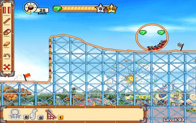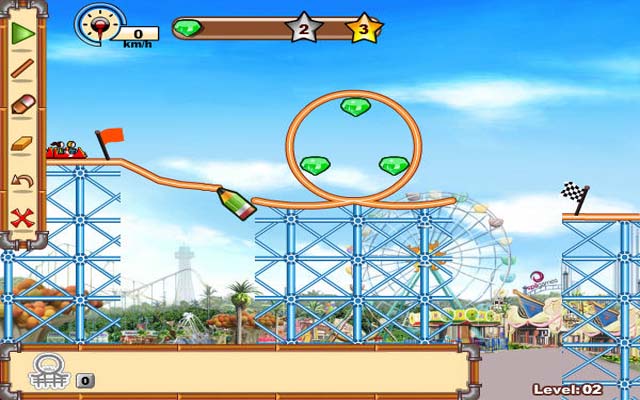 这游戏相当的有意思,你要修建轨道来使得过山车安全到达终点,并尽可能的获得绿钻,过关的方法不止一种,修建各种奇奇怪怪的轨道也是一种乐趣。