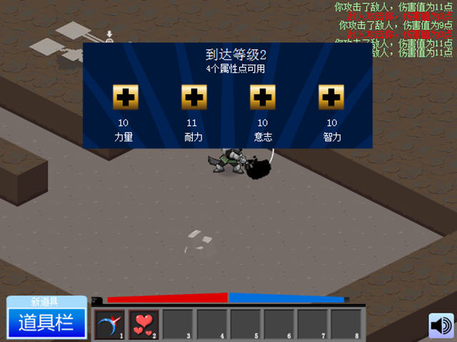 游戏有四项属性和各种抗性,特点是魔法种类很多,而且地图随机生成,理论上可以无限的打下去。装备与武器不单只是攻击和防御的增加,部分附带颜色的装备还加上了属性加持、魔法防御和技能!技能类型五花八门,伤害、群攻、补血、召唤等等应有尽有。