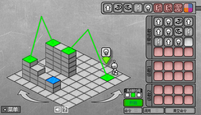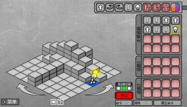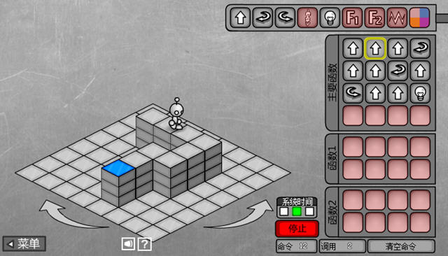 玩家需要做的就是点击上方的各种指令,然后拖到右边的行动框里来控制机器人行动,你需要控制机器人的转弯,跳跃等等各种指令。