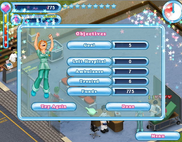 游戏以比较Q版的画面让玩家用比较轻松的心情完成游戏,特别是病人刚来时的脸,绿的,红的,紫的,十分搞笑。