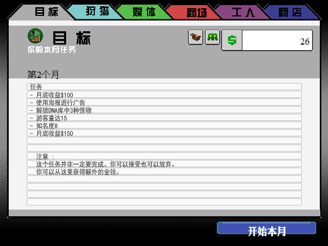 每个月开始的时候是最重要的事情,玩家可以雇佣猎人去世界各地搜寻怪物,得到一些非常珍贵的怪物DNA,可以为你省下来很多钱。