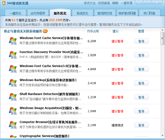 会自动在后台长期运行,方便你在玩游戏前可以暂停无关服务来提高运行速度