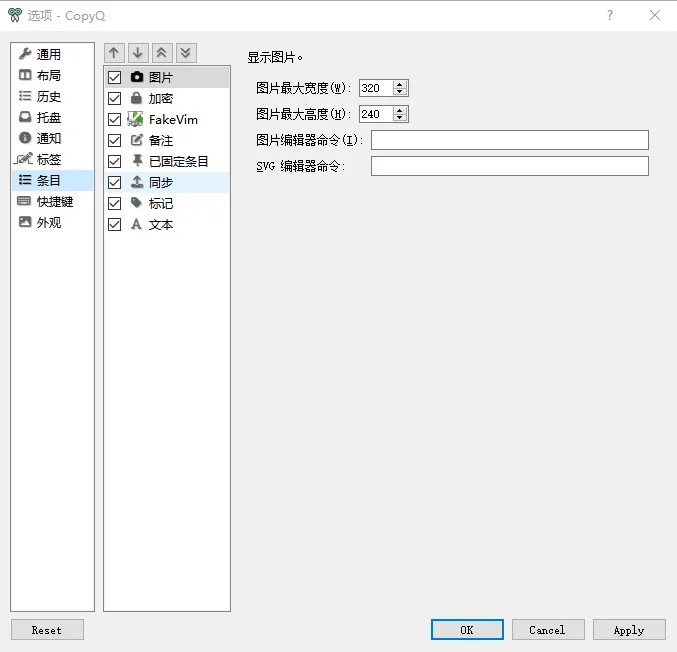 条目选项卡针对保存的剪切板每种类型进行设置,比如针对图片对图片的宽度、高度进行设置。