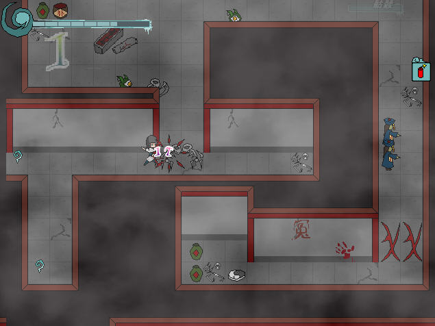 在进入“鬼地”后的第一个地图,这个地图的机关是设在“祭碑”上,需要从下方那个血井中取得“祭血”触发。通过“鬼地”进入地下的“鬼牢”,这里一共2个入口,一个是通往主线剧情的地图,需要触发机关后才能进去的,而触发这个机关需要装备武器“鬼刃”,鬼刃由初期武器“破刃”升级而来。而升级武器的地点要通过第二个入口(即进入鬼牢后左边的入口),进入