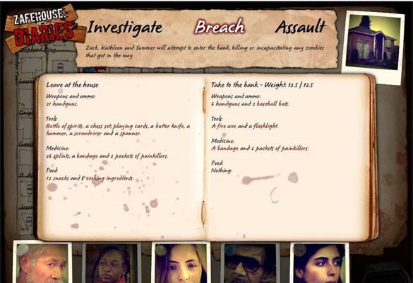 你要学会如何控制安排好他们和平相处,寻找各种物资,并分配和管理好资源。尽可能久的在丧尸之城中存活下来每次新开游戏都是一个全新的日记,都是随机生成的城镇,随机来自各地的5人幸存小组,不同的性格特点(但却总是相同的那么几张人物相片,你也可自行导入自己或朋友的头像相片,来玩场生存游戏)