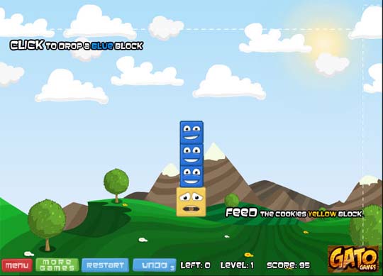 游戏的目标,是利用蓝色方块的堆叠,采摘到空中的曲奇饼并为黄色方块喂食。不得不说,蓝色方块带粘性的设定,在极大程度上降低了游戏的难度。不过,要想把这个物理系的方块游戏全部通关,依然不是一件容易的事情啊!