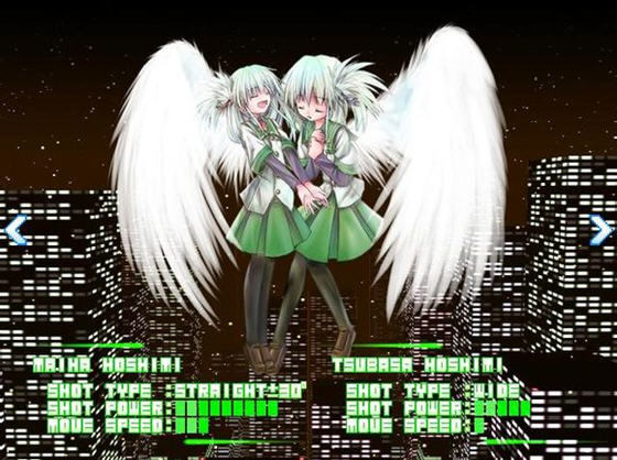 双子PROJECT初代作。虽然因为是初代作,不免会稍显不成熟,但是不失为是一个好作品。游戏难度并不是很高,STG初心者也可以下载来玩的程度。在正常流程通关之后会开启额外的SE关卡。