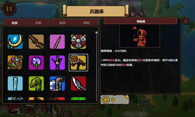 开始关卡前玩家可以自己选择装备以及法杖,点击后会有详细的法杖以及装备介绍,玩家可以来根据自己的需求随意搭配。
