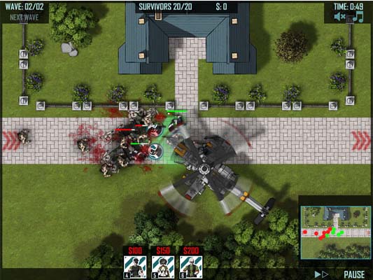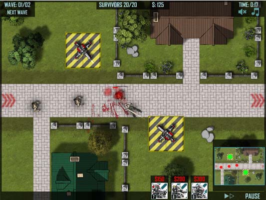 一款以打击僵尸为主题的防御游戏,用于防御的炮塔只有3种,貌似有点单调,但实际上布置士兵部队、放置地雷以及飞机轰炸的技能设定很有点新意,可布置的士兵更有3种之多,可以弥补炮塔类型有限的弱点。需要注意的是,僵尸的攻击是全方位的,连炮塔也会攻击,一定要小心注意炮塔的血量。