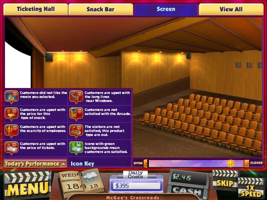 在《电影大亨2:电影也疯狂》中,你扮演的角色是一个新的雇员试图振兴匹克威克先生经营不景气的连锁电影院。接管匹克剧院每天的日常管理。击退竞争对手,忙里忙外的财务预算,管理所有的零食清单,并挑选最好的电影,以提高门票的销售。在这个游戏中尽情发挥你的资金管理能力。创造一鸣惊人的娱乐事业,并建立一家5星级影院帝国。