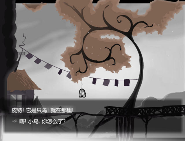 适应“左即右、右即左”,跳过两棵树上绑着的跷跷板,一直走,看到一个人坐在树桥下,烤着蜘蛛,吹着笛子。笛子飞出的“DEBAB”是通关秘籍,再次回到城堡时弹钢琴会用得上。千万要记住。