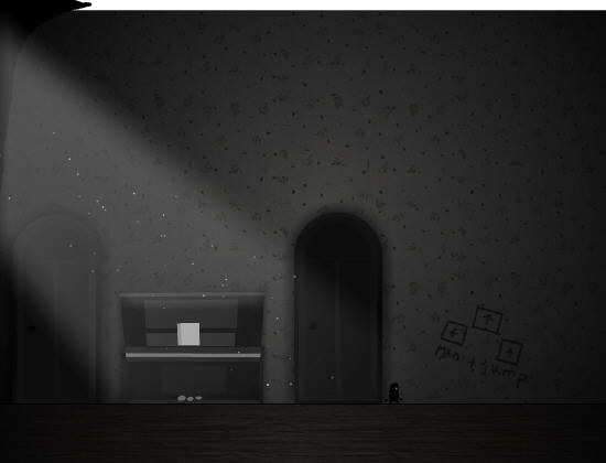 漆黑的屋子中有架钢琴,走近它,它会问你喜不喜欢弹钢琴。你可以选不喜欢,但是到游戏最后必须回来,弹奏钢琴。