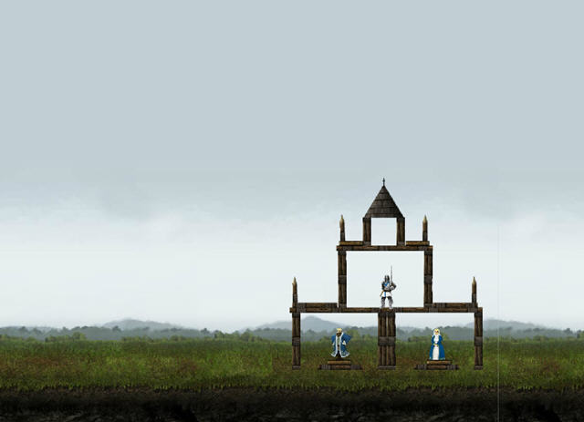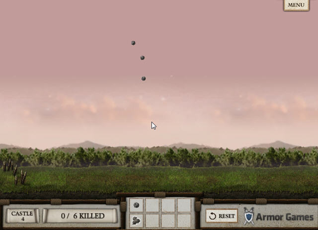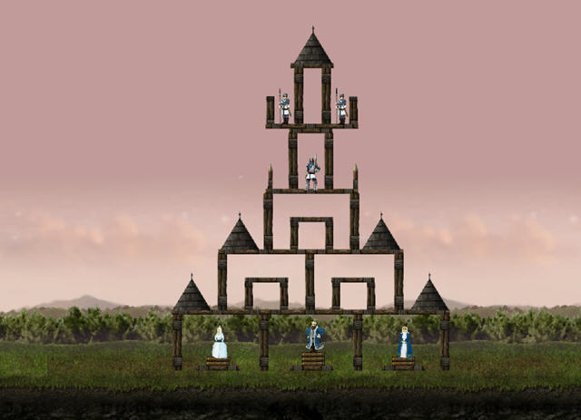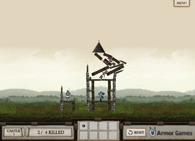 通过投石车把石头抛向城堡,压死里面的士兵、王子、公主、国王、王后,他们一家子。