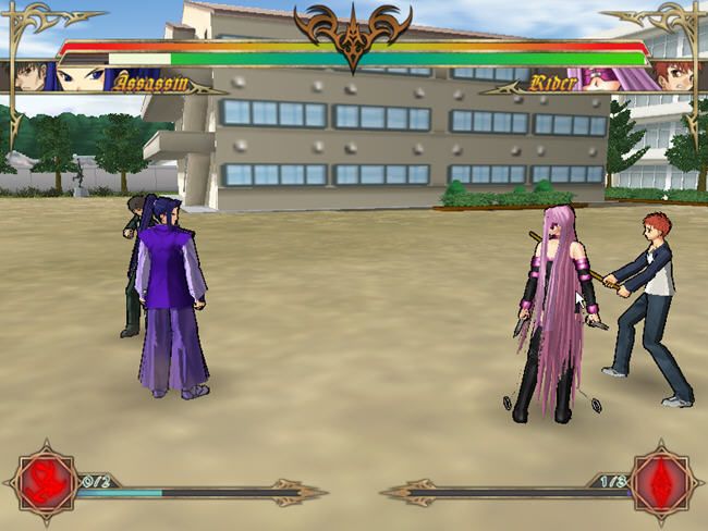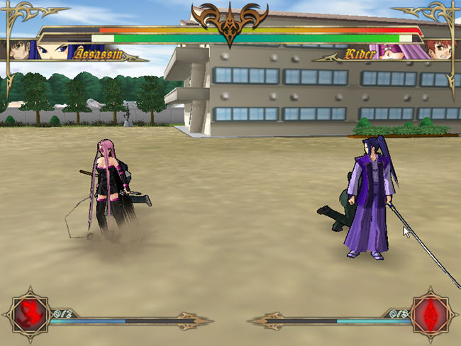 master、servant可自由组队,有三个难度等级,可选择剧情式、human(双人对打)、CPU(与电脑对战)、watch(观看)、training 等游戏模式,耐玩性极高!