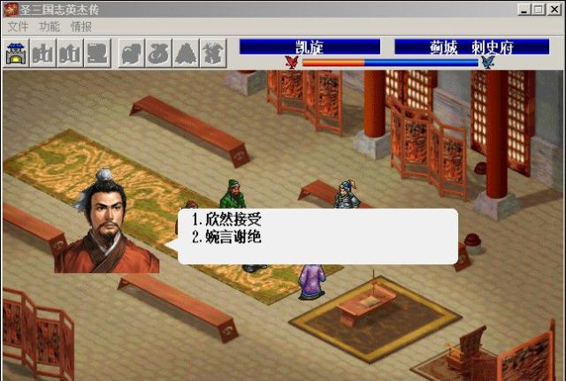 .第一回合敌方行动时曹操等人增援,但是却只是在探情况。第二回合刘备三人出现增援,记得让刘备和孙坚对话,不要让曹操抢了先,这是获得古锭刀的条件之一。对话完孙坚和两只刀兵撤退。