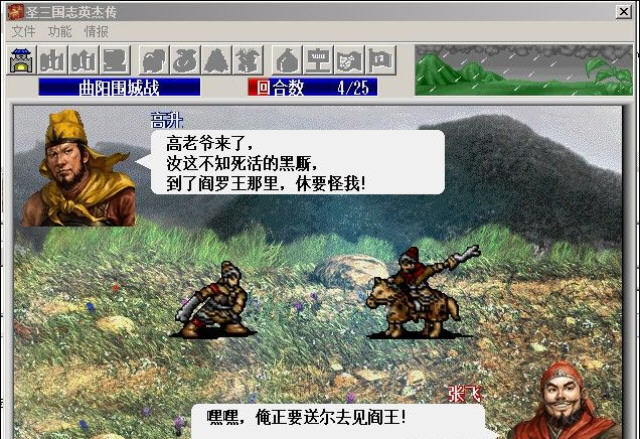 注意从第2回合开始张宝会不停使用妖术效果是我方士气下降+中毒……同时城内的赵弘、孙仲,城外西路的高升等人也开始出击了,东路前边树林里也会出现三个贼兵。让张飞挑死高升。
