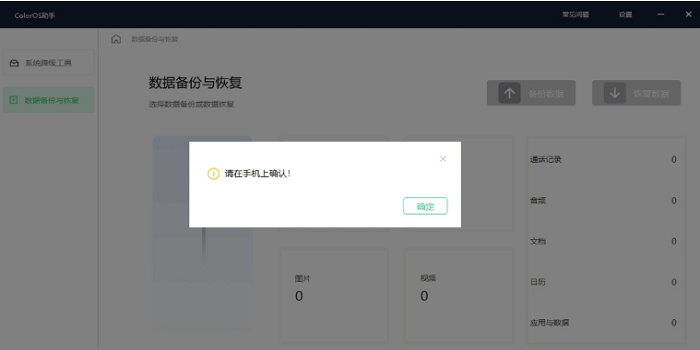 4、在数据备份与恢复界面弹出的“请在手机上确认”对话框中点击“确定”。