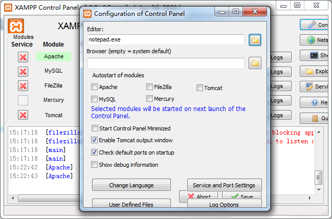 如果配置后apache通过管理面板启动不了,启动或关闭apache,这时能看到具体的报错信息。