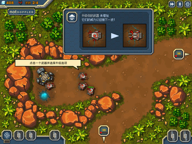 玩家可以使用右下角的炸弹来给缓解当敌人过多时候的压力,当时冷却时间非常长。每次攻击完一波敌人就注意一下炮塔的血量,过低的时候记得修复一下。