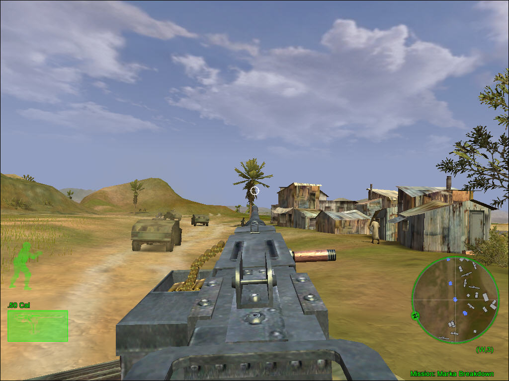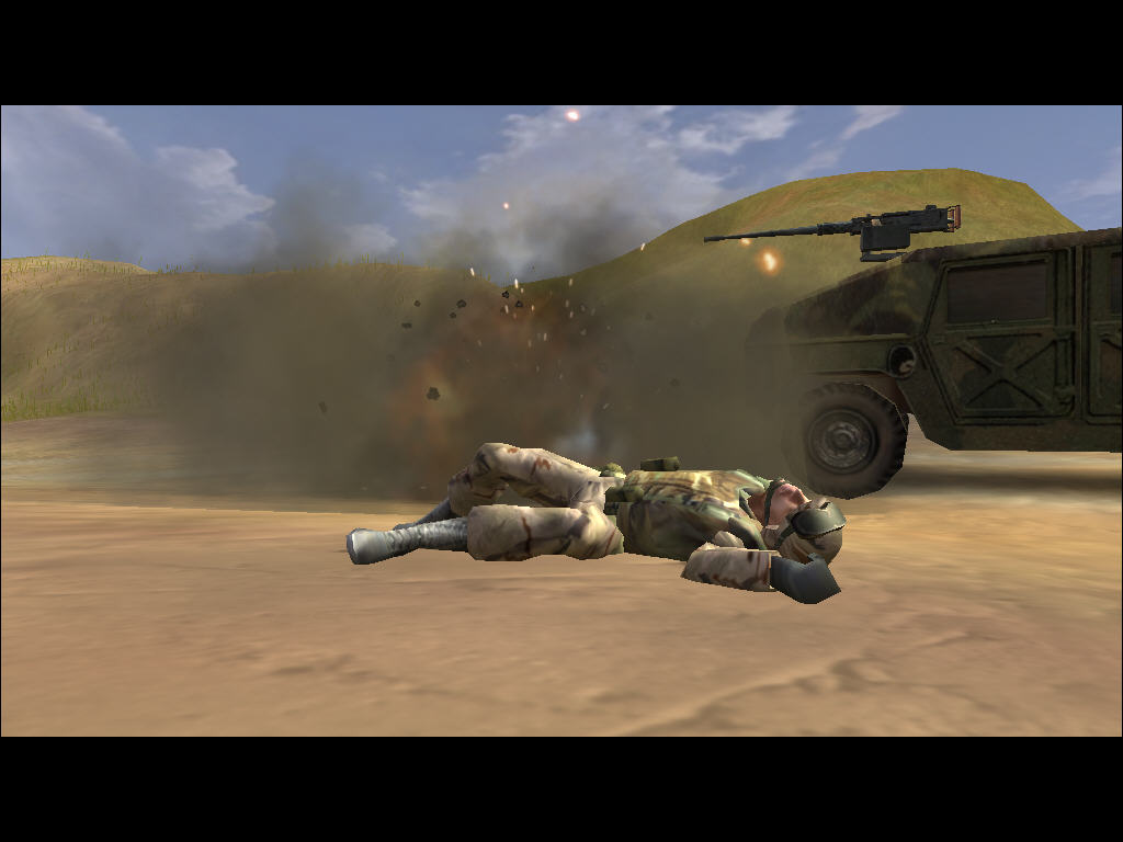 此次BHD的一个重要买点可能就是图像引擎上的进步。这次根据真实事件和电影改编,环境村托是十分重要的,通过目前提供的6段视频来说,nova在这方面作的是相当不错的,很多细节都表现了出来。特别要提到的是游戏的烟雾效果以及环境光,由于使用了《卡曼奇4》的图像升级引擎,诸如直升飞机将地面的尘土打起的效果、城市中燃烧的障碍物冒出的黑烟、爆炸时溅出的碎片,将战场的环境村托异常真实。更令人叫绝的是,在DF3(三角洲特种部队3陆地勇士)中火箭弹只有长长的尾烟,这次不但有长长的尾烟,而且还有尾焰会放射出一定范围的光晕,在建筑物上的爆炸不单单是火光和烟雾,你可以看到被炸塌下的碎石和尘土的掉落,真实自然。阴影处理不再象df3中那样一滩黑影,这次是有真正的形状了,在演示的视频中黑鹰直升飞机飞过头顶时,地面上就会出现很大一块黑鹰的投影,感觉相当好。