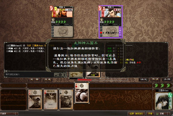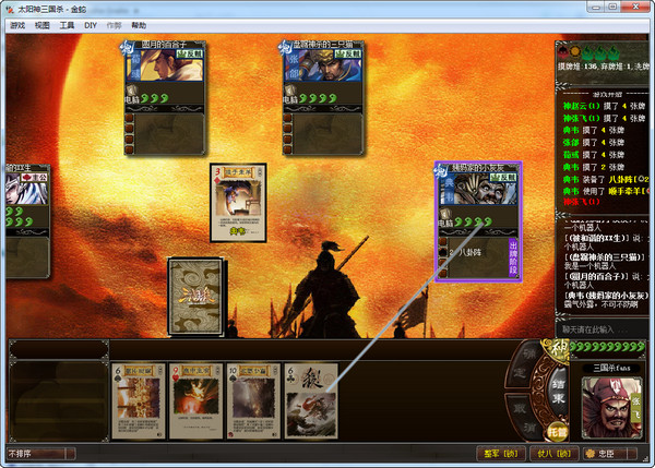 《三国杀太阳神版》顾名思义就是由太阳神制作的一款三国杀游戏。本游戏是真正的《三国杀单机版》,既可以局域网对战,又可以跟电脑对战。三国杀太阳神版不仅继承了官方所推出的扩展包外,还独具特色,新加了自己独有的扩展模式,让三国杀更好玩,更有趣,包括双将模式、魔王模式、夫妻对战、剧情模式等。