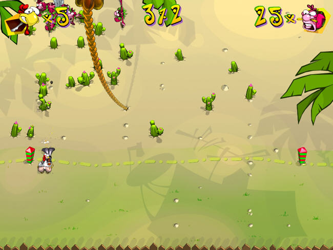 是一款非常搞笑的卡通射击游戏,音乐和画面都相当不错。游戏主角是一只小鸡,为了报仇,它毅然拿起了手中的武器,进行奋力的反抗。游戏的目的是利用手中的猎枪。击退一批又一批来攻的敌人,一旦失手,将会变成敌人的美餐。当一个敌人被打死的时候,他会变成一棵仙人掌,有时还会出现金色的仙人掌哦,可以打出一些宝石、金币,接到后可以增强武器装备,游戏中还需要注意两边的敌人哦,稍不留神就会被压扁。