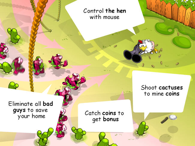 小鸡葆拉与不断涌来的敌人不停的战斗。小鸡葆拉并不愿意跟一般的鸡一样,被当作美味的食物,因此她拿起了武器,准备对这些饥饿的生物展开反击。但这并不是一个简单的任务,因为敌人会一波接着一波蜂拥而至。全鼠标操作,从第2关开始,要时刻注意躲避不停出现的碾路机以及其他东西,主要是考虑玩家的快速反应能力,敌人被击中后变成仙人掌,而这些仙人掌也会成为阻碍你射击的障碍物,好在多射几枪后就会消失,当一些仙人掌变成金色的时候击中它可以得到金币、钻石来加强你的能力。