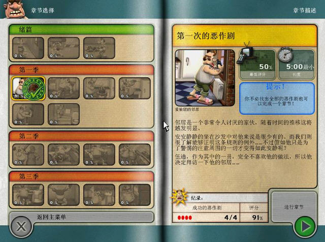 第二种方法:快乐充气垫+沙发——鸡蛋+微波炉——胶水+望远镜——电视天线。 2、午后电视 6个恶搞镜头 道具:泻药、鸡蛋、锯、厕纸、电视机顺序: 第一种方法:厕纸+马桶——鸡蛋+微波炉—整蛊邻居截图—泻药+酒——老头取酒拆鸡蛋时速度锯沙发(敏捷度要高!)(还是推荐在他去拉屎的时候去锯沙发还有放鸡蛋)(这样很有可能满分)(但太需要速度)——躲进衣橱老头跑到厕所后弄电视机天线——弄电视机天线 3、生日惊喜 6个恶搞镜头 道具:强力老鼠夹子、鸡蛋、炮竹、肥皂、厕纸、铅笔、