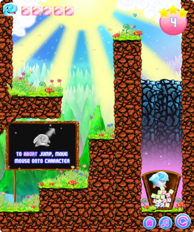画面非常有爱的一款跳跃游戏,玩家要自己控制海豚的跳跃力度以及方向,通过不断的跳跃,来帮助海豚吃到美味的糖果。